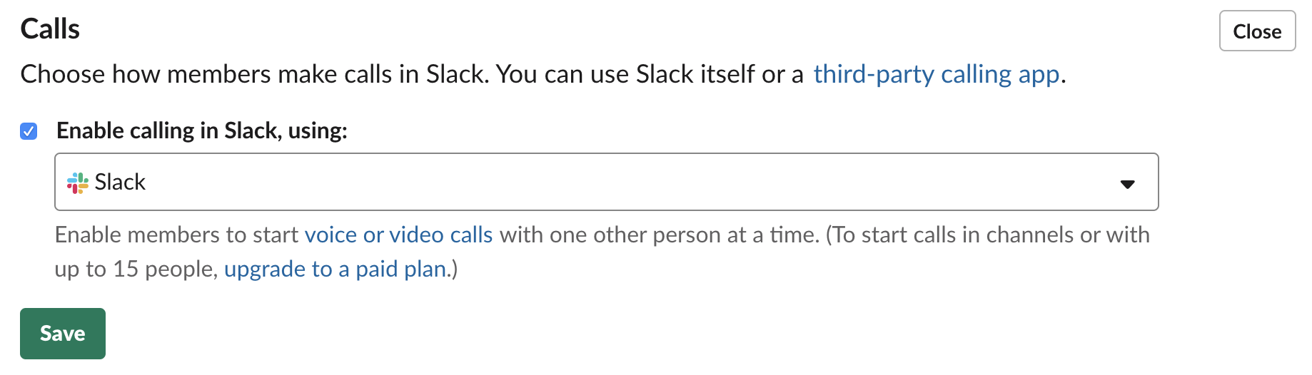 [ Administration > Workspace settings ] 메뉴에 들어갑시다 무료 플랜을 사용하는 경우 슬랙이 제공하는 기본 콜 기능을 1:1 로만 사용할 수 있습니다. 최대 15명까지 연결할 수 있고 데스크탑 화면 공유 기능을 이용하고 싶다면 유료 플랜으로 업그레이드 해야 합니다. 한계는 스탠다드, 플러스, 엔터프라라이즈 그리드로 계약이 변경되더라도 15명이라는 제한이 풀리지 않는다는 점입니다. 서드파티 컨퍼런싱 서비스를 써야하는 이유가 바로 여기에 있습니다.
