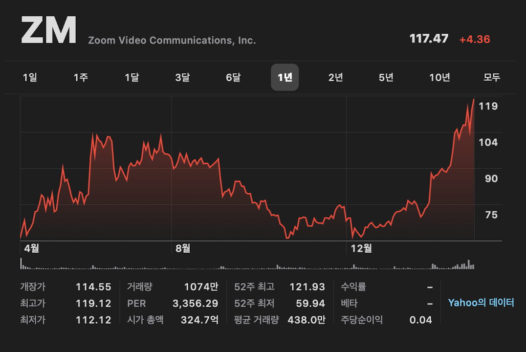 슬랙 콜(Call)의 등장과 관계 없이 시장에는 많은 음성, 화상 회의 솔루션, 서비스가 존재해 왔습니다. 그 중 최근 가장 뜨거운 관심은 받고 있는 서비스가 줌(Zoom)입니다. 코로나19 바이러스의 확산으로 글로벌 경제가 흔들리면서 미국 주식 시장도 많이 흔들리고 있습니다만 굴하지 않고 강한 주가를 보여주고 있는 회사이기도 합니다. 원격 근무와 관련한 비즈니스를 하는 기업들 중에서도 단연 독보적입니다.