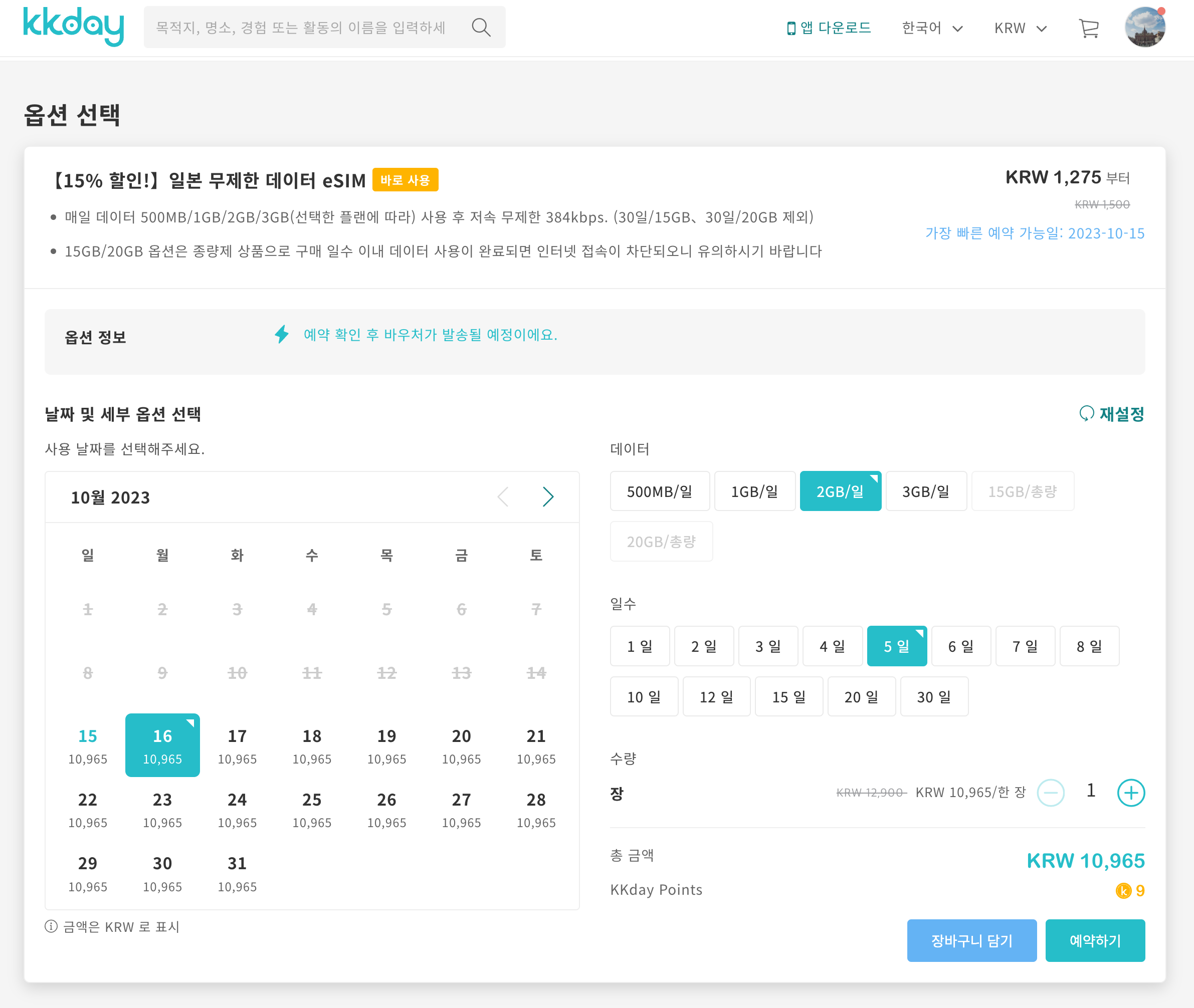 일단 16일 출국이라 요것 기준으로 2GB/일, 5일로 뽑았습니다.