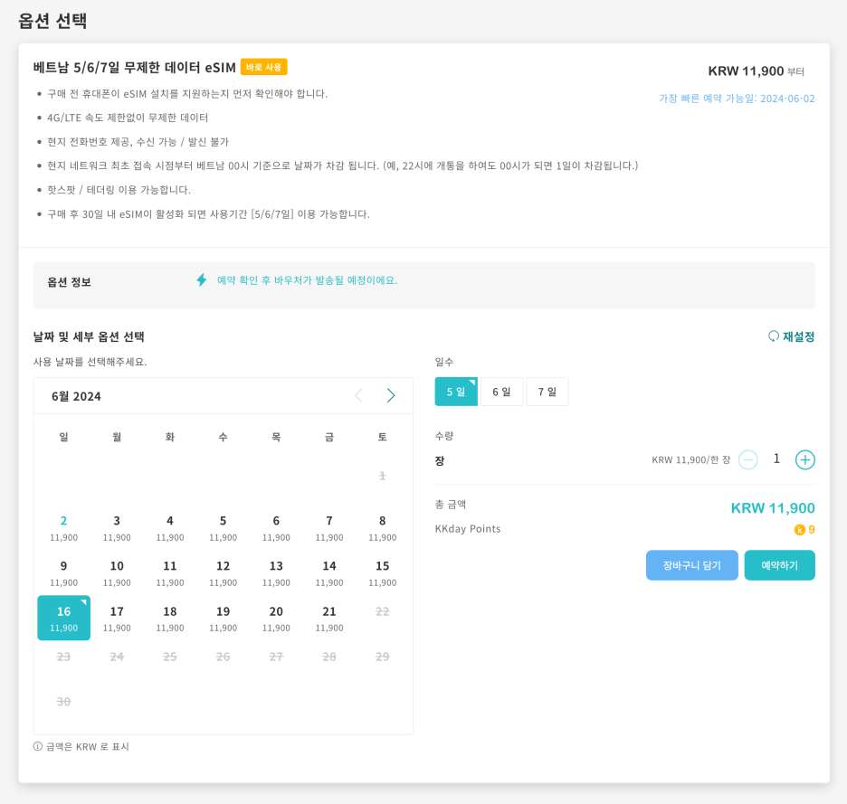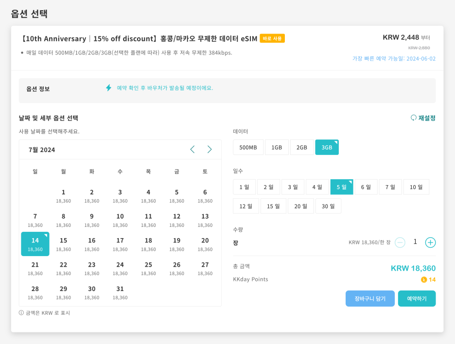 7월 14일로 대충 찍어서 5일간 3GB 쓸 eSIM을 선택해보니