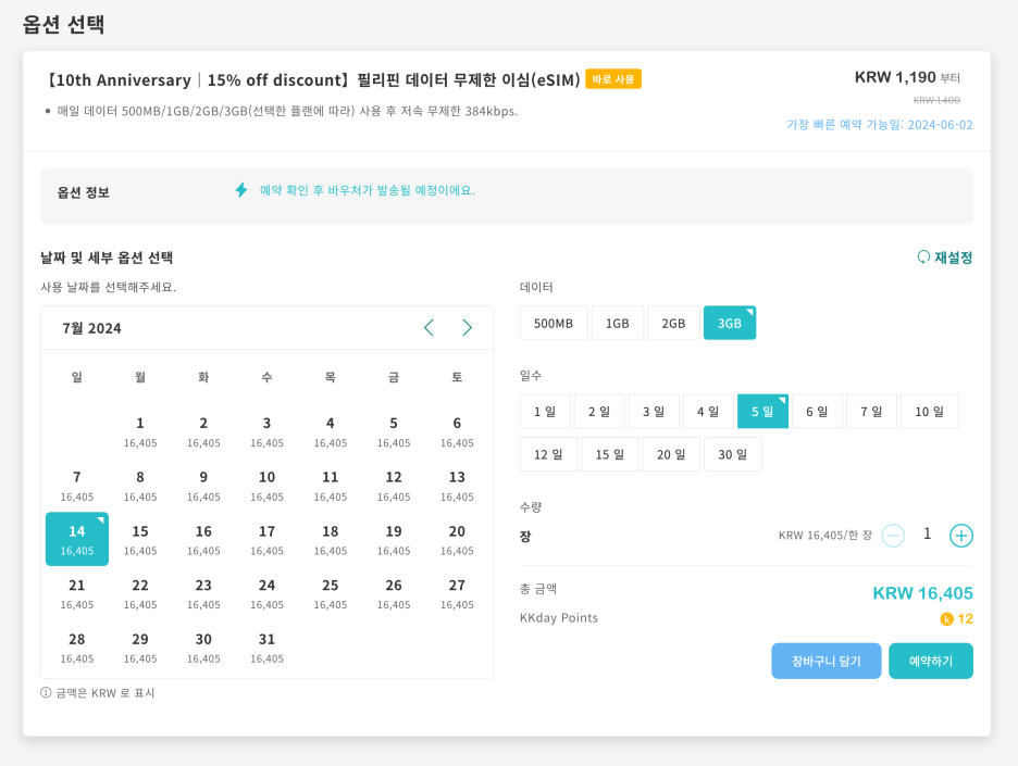 5일간 3GB 옵션을 선택했을때 비용은 16,405원입니다.