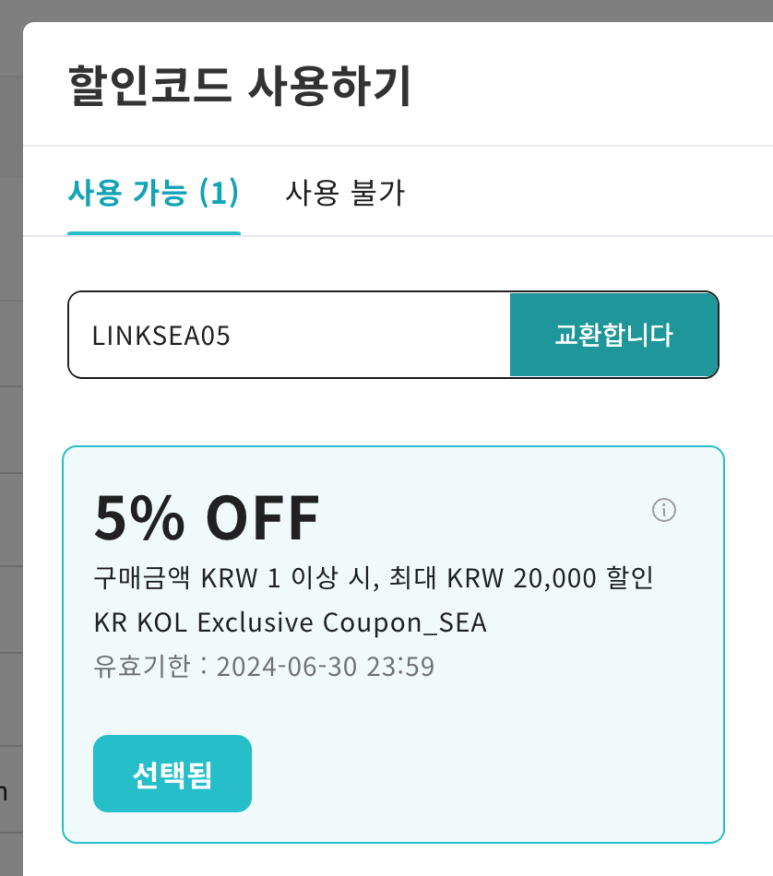 코드는 LINKSEA05 이니 결제 화면에서 "할인코드 사용하기"를 찾아